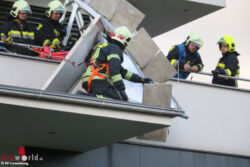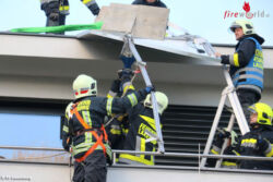Unverzüglich wurde als Erstmaßnahme die Konstruktion mittels Rundschlingen und Arbeitsleinen gegen Absturz gesichert. Nach gesicherten Ausstieg auf das Flachdach wurden mit dem Akku-Kombigerät die Auflagerplatten sowie Photovoltaikpaneele der Konstruktion getrennt. Die einzelnen Elemente wurden anschließend gesichert auf der Dachterrasse abgelegt. Die Freiwillige Feuerwehr Laxenburg stand mit 15 Mitgliedern und drei Fahrzeugen 90 Minuten im Einsatz.