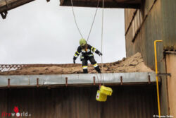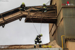 Unter schwerem Atemschutz drangen gleich mehrere Atemschutztrupps in das Innere der Firma vor um mit der Vermisstensuche zu beginnen, schildert Hauptbrandinspektor Wolfgang Findl, der diese schweißtreibende Übung ausgearbeitet hatte. Da sich verletzte Personen auf das Dach retten konnten, wurde diese über die Teleskopbühne und durch einen Höhenrettungstrupp in Sicherheit gebracht. Wenige Augenblicke, nach dem die ersten Trupps zur Menschenrettung vorgedrungen waren, kam der zweite Einsatzbefehl vom Einsatzleiter, Oberbrandinspektor Wolfgang Egger, für den technischen Zug.