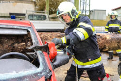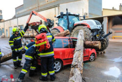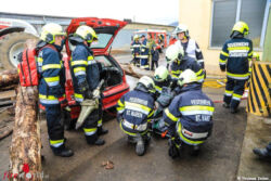 Beim zweiten Szenario wurde neben der Brandbekämpfung der Schwerpunkt auf das Arbeiten mit den verschiedensten technischen Geräten wie Schere und Spreitzer, welche zum Beispiel für das herausschneiden eingeklemmter Personen verwendet wird, gelegt. Während ein Teil der Feuerwehrmänner mit der Suche nach den Opfern unter schwerem Atemschutz beschäftigt waren, kam es zu einem schweren Verkehrsunfall mit eingeklemmter Personen zwischen einem Traktor und einem PKW der durch Schaulustige verursacht wurde. Mit schwerem Bergewerkzeug ausgerüstet wurden dabei ein Kleinkind und ein Erwachsener die im Fahrzeug eingeklemmt wurden von den Einsatzkräften aus dem Fahrzeug geschnitten.