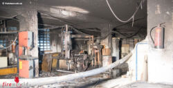 Nach Auskunft des Betriebsinhabers ist eine Lagerbox für Abfälle in Mitten der Betriebsanlage in Brand geraten. Nach Erkundung durch den Atemschutztrupp zeigt sich, dass die umliegenden Bereiche ebenfalls Feuer gefangen hatten.