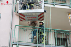 Über die Drehleiter wurden in der Zwischenzeit zwei Personen von einem Balkon gerettet, das Hubrettungsgerät diente in weiterer Folge zur Brandbekämpfung. Über den Korb der Drehleiter wurde ein Atemschutztrupp der Feuerwehr Sooß nach oben ins Gebäude gebracht.