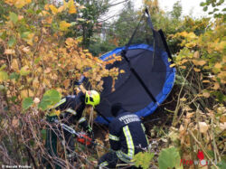Das Spielgerät blieb in den Sträuchern hängen. Mit der Motorsäge schnitten sich die Feuerwehrmänner einen Weg zum Trampolin und konnten das Spielgerät bergen.