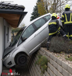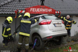 Ein Pkw war aus unbekannter Ursache ins Rollen geraten und nach einer 30 Meter Fährt über eine Gartenmauer in das Nachbarhaus gestürzt. Mit dem Kranfahrzeug der Feuerwehr Enns wurde das Auto geborgen und wieder auf alle vier Räder gestellt.