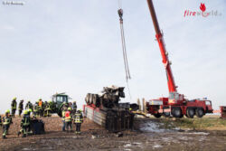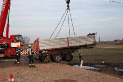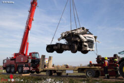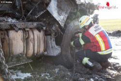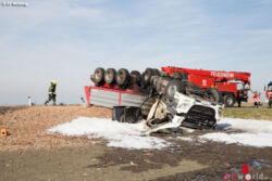MOOSBRUNN (NÖ): Zu einem schweren Lkw-Unfall im Gemeindegebiet von Moosbrunn (Bruck an der Leitha) wurde Kran Mödling um die Mittagstunden des 4. November 2017 alarmiert. Aus unbekannter Ursache kam der Lenker eines Sattelschleppers von der Fahrbahn ab, überschlug sich und ging in Flammen auf.