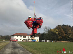 Die Einsatzkräfte mussten mit den Rettungsgeräten zu Fuß zur Unfallstelle vorrücken. Nach Lageerkundung und Rücksprache mit dem Notarzt wurde eine Seilbergung mittels Notarzthubschrauber (C10) vorgenommen, um den Patienten schonend aus dem unwegsamen Gelände zu retten. Die Person mit Verletzungen unbestimmten Grades wurde erstversorgt und ins Krankenhaus geflogen.