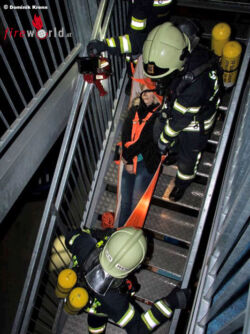 Nachdem die ersten Feuerwehrfahrzeuge in Stellung gebracht wurden, machte sich ein Atemschutztrupp im Gebäude auf die Suche nach den Vermissten Mitarbeitern.