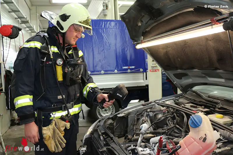 Während Service- und Wartungsarbeiten an einem Kundenfahrzeug schlugen dem daran arbeitenden KFZ-Techniker plötzlich Flammen aus dem Motorraum entgegen. In geistesgegenwärtiger Reaktion griff die Kollegschaft nach den, in der Montagehalle positionierten Feuerlöschern und startete sofort die Brandbekämpfung am Pkw.