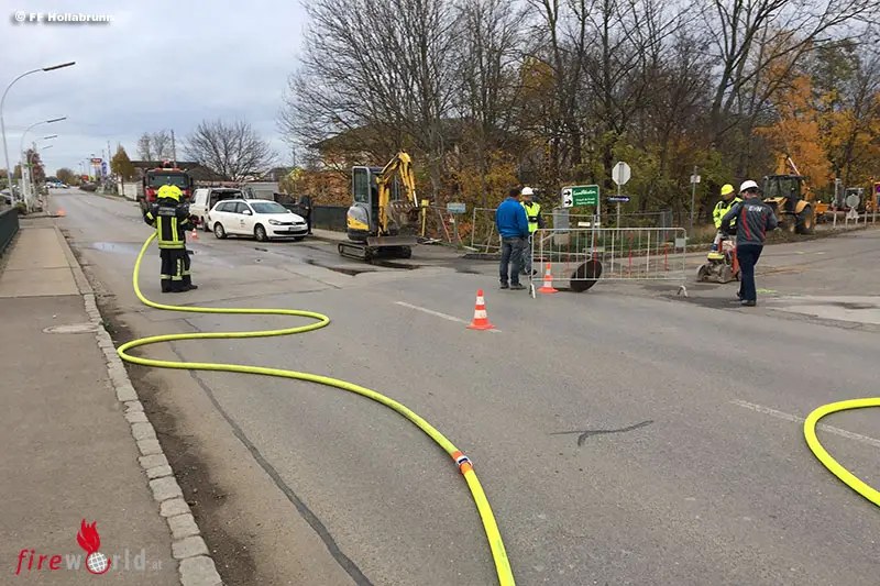 HOLLABRUNN (NÖ): Im Kreuzungsbereich Znaimerstrasse # Industriestrasse in Hollabrunn kam es am 11. November 2017 vermutlich auf Grund von Tiefbauarbeiten zur Beschädigung einer Gasleitung, die einen massiven Gasaustritt zur Folge hatte.