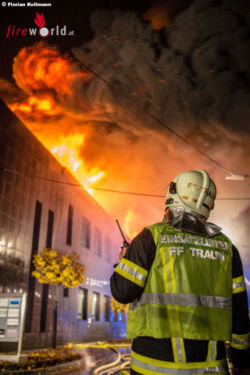 Der Brandverdacht, zu dem die Feuerwehr Traun um 17.30 Uhr in den Stadtteil St. Martin gerufen wurde, entwickelte sich innerhalb kürzester Zeit zu einem Großbrand. Die Flammen breiteten sich über die Styroporschüttung einer Zwischendecke unaufhaltsam und blitzschnell aus. Innerhalb kürzester Zeit stand das gesamte Dach der etwa 2.000 Quadratmeter großen Halle in Vollbrand.