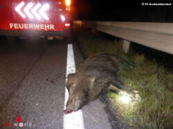 In den Nachtstunden kam es auf der B4 zu einem Verkehrsunfall mit einem Wildschwein, aufgrund dessen sich ein nicht mehr fahrtüchtiges Fahrzeug am Straßenrand befand. Die alarmierte Feuerwehr Großweikersdorf sicherte die Unfallstelle bis zum Eintreffen der Polizei ab, anschließend wurde mittels Abschleppstange das Unfallfahrzeug von der Fahrbahn entfernt und gesichert abgestellt. Nachdem ausgelaufene Betriebsflüssigkeiten gebunden waren, konnte wieder ins Feuerwehrhaus eingerückt werden.