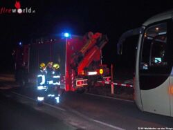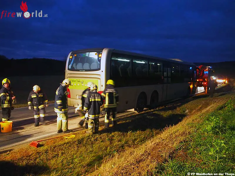 WAIDHOFEN AN DER THAYA (NÖ): Am 13. November 2017, um 16.43 Uhr, wurden die Feuerwehren Altwaidhofen und Waidhofen an der Thaya zu einem Einsatz auf der Landesstraße 60 Richtung Matzles alarmiert. Nach einem Motorschaden bei einem Autobus musste eine massive Ölspur gebunden und der Autobus geborgen werden.