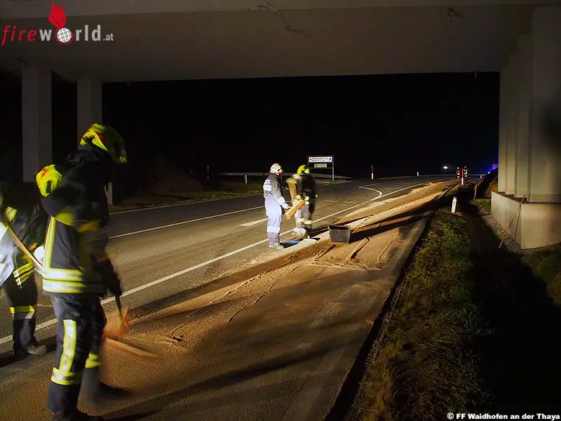Die zur Hilfe angeforderten Einsatzkräfte der beiden Feuerwehren wurden um 16.43 Uhr von der NÖ Landeswarnzentrale alarmiert. Am Einsatzort wurden die Kameraden der örtlich zuständigen Feuerwehr Altwaidhofen beim Binden der mehrere hundert Meter langen Ölspur unterstützt. Weiters wurden im Laufe des Einsatzes die Straßenmeisterei Waidhofen/Thaya mit Ölspur-Verkehrszeichen und eine Streife der Polizei für die Sperre der Fahrspur Richtung Matzles angefordert.