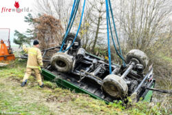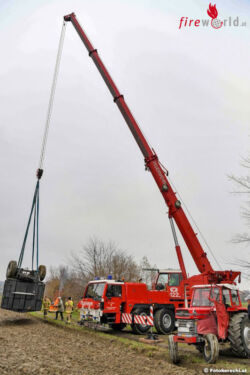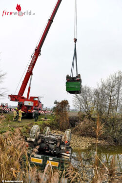 Für die Bergung der Anhänger rückte neben der Freiwilligen Feuerwehr Mühldorf auch die Berufsfeuerwehr Linz mit ihrem Kran zum Assistenzeinsatz an. Die Kipper wurden aus dem kleinen Teich gehoben, die Zuckerrüben wird der Bauer selbst im Laufe des Nachmittags aus dem Wasser holen.