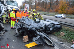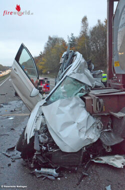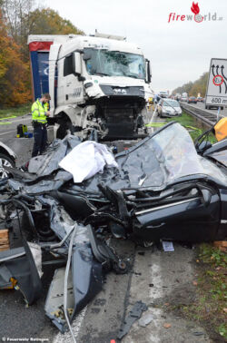 Kurz vor acht Uhr kam es auf der BAB 3 in Fahrtrichtung Oberhausen kurz vor dem Autobahnkreuz Breitscheid zu dem schweren Verkehrsunfall. Aus bislang ungeklärter Ursache krachten zwei Lkw und fünf Pkw ineinander. Durch den Unfall wurden drei Fahrzeuge komplett zerstört. Zwei Personen wurden in den Wracks schwerst eingeklemmt und mussten von der Feuerwehr mit schwerem Gerät befreit werden.