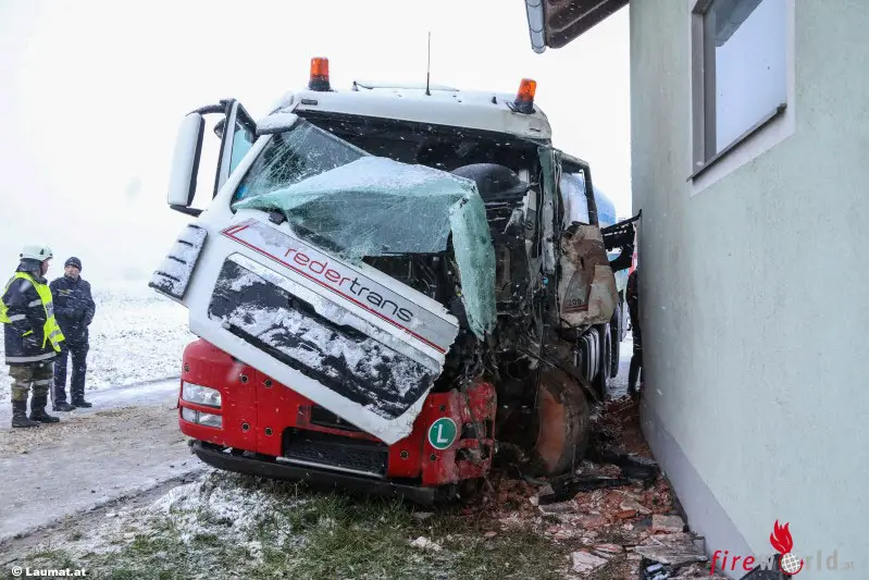 ESCHENAU IM HAUSRUCKKREIS (OL): Einen Schwerverletzten forderte Sonntagfrüh, 19. November 2017, ein Verkehrsunfall mit einem Milchtransporter in Eschenau im Hausruckkreis (Bezirk Grieskirchen). Der Lenker eines Milchtransporters verlor bei winterlichen Straßenverhältnissen aus bisher unbekannter Ursache die Kontrolle über seinen Lkw und krachte gegen das Eck eines Garagengebäudes.