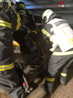 Unterdessen wurde das hydraulische Rettungsgerät vorbereitet, das später zum Einsatz gebracht werden musste. Ordnungsgemäß wurde der Brandschutz erweitert. Gleichzeitig wurde auch für die notwendige Beleuchtung des Einsatzortes gesorgt, wodurch man erst ein umfassendes Bild vom Ausmaß der Zerstörung bekam. Autowrackteile lagen im Umkreis von etwa 20 Metern über das gesamte Betriebsgelände verteilt.