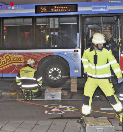 Dabei kam es zu einer Kollision des Busses mit der Frau. Dabei wurde die Frau unter der ersten Achse eingeklemmt. Seitens der Berufsfeuerwehr wurde der Einsatzführungsdienst, ein Löschzug, ein Rüstwagen sowie ein Notarzteinsatzfahrzeug an die Einsatzstelle alarmiert. Die Einsatzkräfte leiteten am Unfallort eine sofortige Rettung mittels Lufthebekissen ein. Jedoch kam für die 82-Jährige jede Hilfe zu spät.