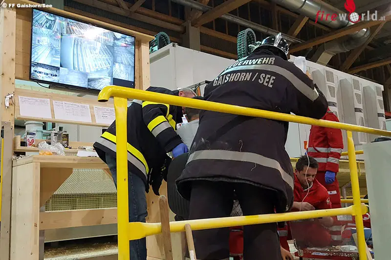 Die Erkundung durch die Einsatzleitung ergab folgende Ausgangslage: Ein Arbeiter stürzte aus ungekärter Ursache in einen ca. 5 Meter tiefen Schacht unter einer Maschine, jedoch war er noch selber fähig, mit Verletzungen unbestimmten Grades daraus heraufzuklettern. Parallel dazu bereitete die Mannschaft im Außenbereich bereits alles für eine Rettung des Verletzten aus der Tiefe vor, dies war jedoch schließlich nicht mehr nötig.