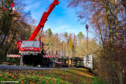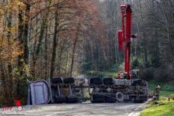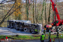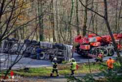 FELDBACH (STMK): Montagvormittag, 20. November 2017, stürzte auf der B66, Gleichenbergerstraße, (Stadtgemeinde Feldbach, Ortsteil Mühldorf) auf Höhe Taxberg ein mit Schotter beladener Lkw-Sattelzug um und blieb quer über der B66 liegen. Der Fahrer musste von der Feuerwehr aus dem Führerhaus befreit werden.