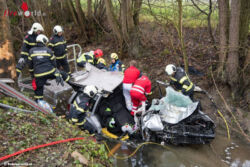 Ein Pkw-Lenker aus dem Bezirk Linz Land ist mit seinem Fahrzeug aus bisher noch ungeklärter Ursache von der Fahrbahn abgekommen und rund 120 Meter über eine Wiese geschlittert, bevor er mit der Beifahrerseite frontal gegen einen Baum prallte. Durch die Wucht des Aufpralles wurde er in den danebenliegenden Bach geschleudert. Da die Unfallstelle schwer erreichbar war, mussten die Einsatzkräfte zuerst einen Zugang schaffen, bevor sie zum Verunfallten vordringen konnten. Beim Auto musste für die Menschenrettung das Dach abgenommen werden und in weiterer Folge wurde die Vorderseite des Autos weggedrückt, um den Verletzten aus seinen Wagen befreien zu können.