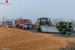 PERG (OÖ): Zu einem Zugunfall ist es Freitagmittag, 1. Dezember 2017, in Perg gekommen. Ein Garnitur der Donauuferbahn rammte kurz vor Mittag einen mit 18 Tonnen Mais beladenen Lkw.