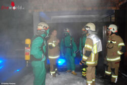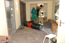 Während das ausgetretene Granulat in ein Edelstahlfass umgelagert wurde, brachten weitere Kräfte zwischenzeitlich unter Schutzstufe 2 ein Be- und Entlüftungsgerät in Stellung. Mit Hilfe dessen konnten aus den betroffenen Räumlichkeiten die Dämpfe abgesaugt und im Freien durch einen weiteren Atemschutztrupp mittels Wasser niedergeschlagen werden. Zudem führten die Einsatzkräfte laufend Messungen durch, bis dass alle Werte im ungefährlichen Bereich lagen.