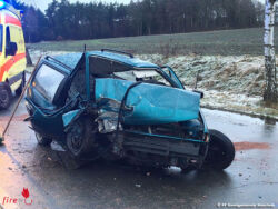 Völlig zerstört ist das Fahrzeug auf der Fahrbahn liegen geblieben. Die beiden Insassen mussten von der Feuerwehr aus dem Wrack befreit werden. Anschließend wurden sie an den Rettungsdienst übergeben. Bei dem Unfall wurden eine Person schwer, die zweite Person leichter verletzt. Mit Bindemitteln wurden die aus dem Fahrzeug ausgetretenen Flüssigkeiten aufgenommen.