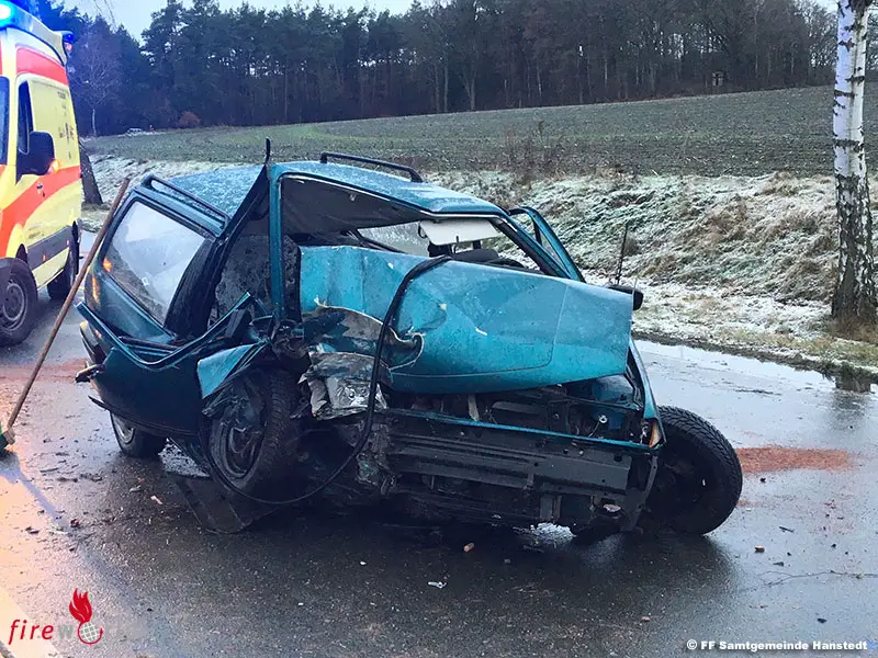 HANSTEDT (DEUTSCHLAND): Am frühen Nachmittag des 8. Dezember 2017 wurden die Feuerwehren aus Evendorf und Egestorf zu einem Verkehrsunfall alarmiert. Auf der Ortsumgehung Evendorf war ein Kleinwagen von der Straße abgekommen und gegen einen Baum geprallt.