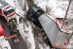 PERG (OÖ): Ein Sattelschlepper ist am Montagvormittag, dem 11. Dezember 2017, auf der Naarntal Bundesstraße von der Fahrbahn abgekommen und über eine Böschung gestürzt.