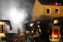 Als die ersten Einsatzkräfte wenig später an der Einsatzstelle eintreffen, stehen zwei Gartenlauben annähernd in Vollbrand. Als Erstmaßnahme gehen zwei Trupps, ausgerüstet mit Atemschutzgeräten, zur Brandbekämpfung vor und können ein Ausbreiten der Flammen verhindern. Um alle Glutnester ablöschen zu können, werden die Lauben ausgeräumt und müssen teilweise demontiert werden. Die beiden Lauben sind durch die Brandeinwirkung und das Aufnehmen der Glutnester nicht mehr verwendbar.