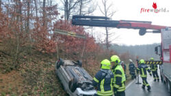 RETZ (NÖ): Die Feuerwehr Retz und die Feuerwehr Niederfladnitz wurden am 15. Dezember 2017 in den frühen Morgenstunden zu einem Verkehrsunfall mit eingeklemmter Person alarmiert. Auf der Straße zwischen Retz und Hofern kam ein Pkw ins Schleudern und blieb nach einem Überschlag auf der Böschung liegen.