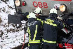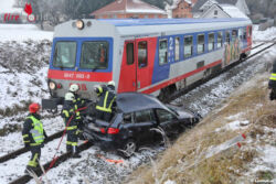 Der Lenker des Autos erlitt ersten Informationen zufolge zum Glück nur leichte Verletzungen. Feuerwehr, Rettungsdienst, Notarzt und Polizei standen im Einsatz. Die Feuerwehr musste den Pkw vom Zug trennen und anschließend bergen.