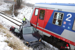 SATTLEDT (OÖ): Ein Auto wurde Dienstagnachmittag, 19. Dezember 2017, in Sattledt (Bezirk Wels-Land) von einem Triebwagen erfasst und mitgeschliffen.