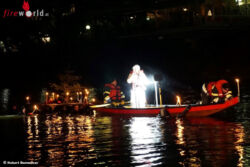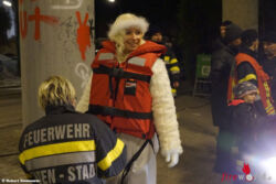 Die Taucher und Schwimmer wünschten den zahlreich erschienenen Gästen ein gesegnetes Weihnachtsfest und ein gutes neues Jahr. Das Christkind richtete Grußworte an die Besucher, die sich, animiert durch das Christkind, mit einem einfachen DANKE für die Leistungen der Feuerwehr in ihrer Freizeit revanchierten. Von der Brücke ging die Fahrt weiter bis zur Slippanlage der Freiwilligen Feuerwehr Leoben-Stadt, wo das Christkind trockenen Fußes wieder festen Boden betreten konnte.