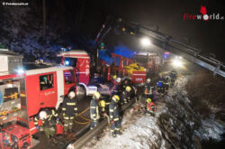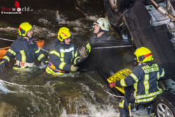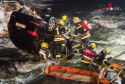 Als die ersten Einsatzkräfte an der Unfallstelle eingetroffen sind, wurde ein Fahrzeug im Wasser am Dach liegend vorgefunden. Eine erste Lageerkundung ergab, dass eine Person im Fahrzeug eingeklemmt und noch ansprechbar ist. Unverzüglich wurde mit der Personenrettung begonnen und weitere Einsatzkräfte zur Unterstützung nachalarmiert. Die Feuerwehrmänner stiegen, gesichert von der Straße aus über Leitern in den Fluß und versuchten die Person aus dem Fahrzeug zu befreien. Durch die Wassertemperatur von nur 2 Grad Celsius mussten die im Wasser stehenden Einsatzkräfte an ihre körperlichen Grenzen gehen um den Fahrer zu befreien.