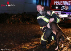 Bei der Erkundung musste der Einsatzleiter jedoch erschreckend feststellen, dass sich die dreiköpfige Familie samt ihren Haustieren noch in der völlig verrauchten Wohnung, im 4. Obergeschoss, befand. Unverzüglich wurde ein Atemschutztrupp zur Menschen- und Tierrettung in das Wohngebäude entsandt. Alle Personen sowie ein Hund und eine Katze konnten rasch an die frische Luft begleitet und dem Rettungsdienst übergeben werden. Hier stellte sich heraus, dass das nervöse Bellen der Hündin die Familie weckte und dadurch auf die lebensbedrohliche Situation in der Wohnung aufmerksam machte.
