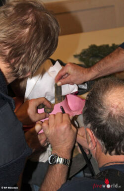 Das kleine Mädchen hatte in einem unbeobachteten Moment einen Kinder-WC-Sitz über den Kopf geschoben. Zusammen mit einer Bekannten versuchte die Mutter zu Hause alles, um die Tochter von dem Sitz zu befreien. Weder leichtes ziehen, noch der Einsatz von Cremes konnten dabei helfen. In ihrer Not packten die beiden Frauen das kleine Mädchen ein, gingen zur Feuerwache 2 und baten dort um Hilfe.