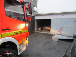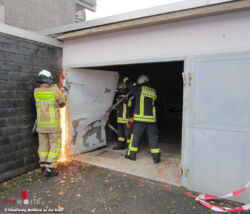 in mit zwei Personen besetzter Pkw war aus ungeklärter Ursache auf abschüssiger Straße frontal in eine verschlossene Garage geprallt. Das Fahrzeug kam erst nach Durchbrechen des Garagentores und einer weiteren tragenden Garagenwand zum Stillstand. Die zwei leicht verletzten Personen konnten sich noch vor Eintreffen der Feuerwehr aus ihrer Lage befreien. Diese wurden anschließend durch den Rettungsdienst versorgt und in ein naheliegendes Krankenhaus verbracht.