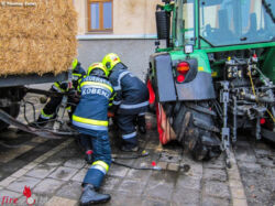KOBENZ (STMK): Zu einem schweren Verkehrsunfall mit eingeklemmter Person rückte am 3. Jänner 2018 gegen 12:50 Uhr ein Großaufgebot an Einsatzkräften aus. Aus nicht näher bekannten Umständen fuhr ein mit Strohballen beladener Traktor auf der L518 in Kobenz frontal gegen eine Hausmauer, wobei der Fahrer aus dem Traktor geschleudert und zwischen der Fahrerkabine und der Hausmauer eingeklemmt wurde.