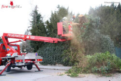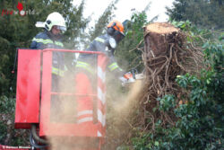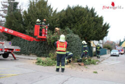An der Einsatzadresse angekommen, konnte Einsatzleiter BI Martin Gall feststellen, dass ein Baum entwurzelt wurde und nur mehr am gemauerten Zaun lehnte. Um die Gefahr eines Umstürzens auf den Gehsteig zu verhindern, wurde das Hubrettungsfahrzeug in Stellung gebracht. Mittels Motorkettensäge wurde der Baum zerkleinert und gesichert am Grundstück abgelegt. Mit Hilfe einer Arbeitsleine zogen die Einsatzkräfte den verbleibenden Baumstamm zurück aufs Areal. Nach rund einer Stunde konnten die 15 Mitglieder mit ihren vier Fahrzeugen wieder ins Feuerwehrhaus einrücken um mit den Reinigungsarbeiten zu beginnen.