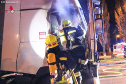 Nach dem Eintreffen der Feuerwehr begann der Einsatzleiter sofort mit der Lageerkundung und stellte einen Brand in der Fahrerkabine eines Lkw fest, wobei die Gefahr des Übergreifens des Brandes nicht auf den aufgesattelten Anhänger drohte. Dieser Umstand war bereits anwesenden Personen zu verdanken, die eine Ausbreitung mit mehreren Feuerlöschern verhinderten.
