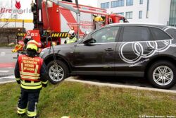 Die um 14.55 Uhr zu Hilfe gerufene Freiwillige Feuerwehr Wiener Neudorf konnte das Fahrzeug mit dem Kran des schweren Rüstfahrzeuges nach wenigen Minuten Arbeit schonend wieder zurück auf den Parkplatz stellen.