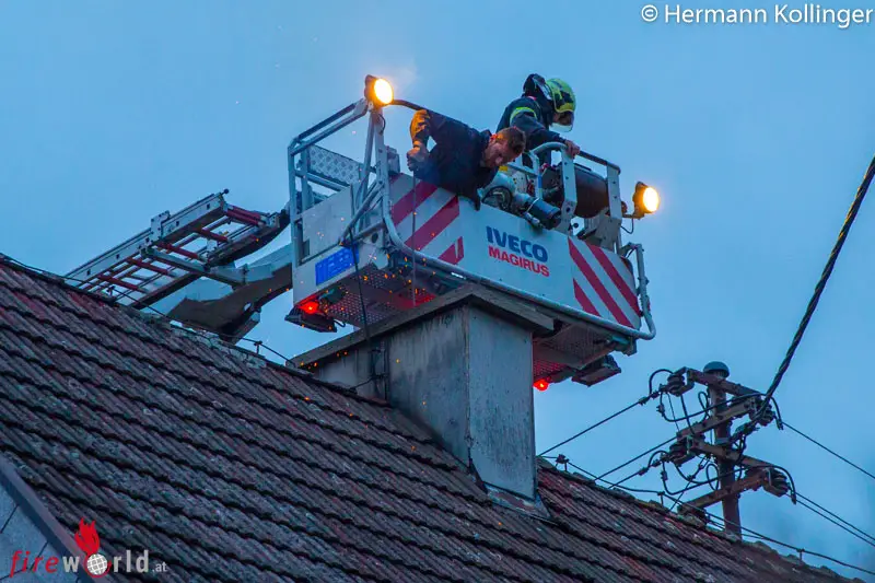Die um 06.45 Uhr alarmierten Kräfte der Alkovener Feuerwehr, die mit dem Tanklöschfahrzeug, der Teleskopmastbühne sowie dem Rüstlöschfahrzeug am Einsatzort eingetroffen sind, führten unverzüglich eine erste Erkundung im Dachbodenbereich durch. In dem im Inneren brennenden Kamin wurden in der Erstphase per Wärmebildkamera Temperaturen von bis zu 750°C gemessen. Sowohl im Innenbereich des Dachbodens als über die Teleskopmastbühne im Außenbereich wurden umfassende Kontrollen in Hinblick auf eine mögliche Brandbildung durch den Funkenflug durchgeführt.