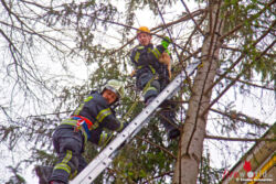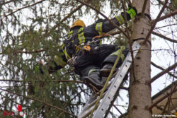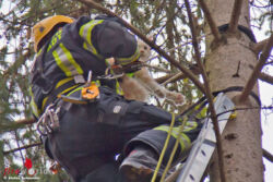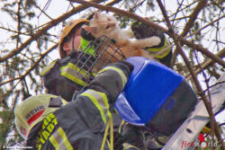 Ein weiterer Feuerwehrmann stieg ebenfalls auf, um die junge Main Coone-Katze in luftiger Höhe in eine Transportbox zu bekommen. Am Boden wieder sicher angekommen konnte dann „Mau-Mau" an ihre Besitzerin übergeben werden.