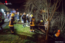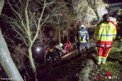 Couragierte Anrainer sicherten den Pkw mit Hilfe einer Seilwinde gegen ein weiteres Abrutschen und alarmierten die Rettungskräfte. Nach einer kurzen Erkundung wurde mit Hilfe von zwei Schiebeleitern ein leichterer Zugang zum Patienten für den Rettungsdienst geschaffen. Nach der Erstversorgung wurde der Patient mit Hilfe eines Spineboards und mit einer Leine gesichert über die Leiter zum Rettungswagen transportiert. Nach einer weiteren Versorgung durch die anwesende Notärztin wurde der verletzte Pkw-Lenker in das Universitätsklinikum Krems eingeliefert. Der Pkw wurde nach dem Abtransport der verletzten Person mit der Seilwinde auf festen Untergrund gezogen und nach Absprache mit den Angehörigen abgestellt.