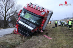 Die Kräfte von Feuerwehr, Rettungsdienst und Polizei standen im Großeinsatz. Schwierig gestaltete sich auch die Bergung des verunfallten Lastwagens, weil eine größere Menge Diesel ausgetreten ist. Erdreich musste abgebaggert werden.