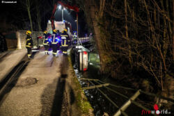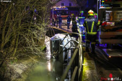 In der Ortschaft Staig im Gemeindegebiet von Schlatt kam ein Lenker aus bisher unbekannter Ursache von der Fahrbahn ab, verfing sich mit dem Auto im Geländer und rutschte anschließend mit dem Auto in den Bach. Der Mann konnte sich ersten Angaben zufolge selbst aus dem Fahrzeug befreien. Die Feuerwehr Schwanenstadt musste den Pkw mit dem Kran des Schweren Rüstfahrzeuges (SRF) aus dem Bachbett bergen und stellte ihn an einem gesicherten Ort ab. Eine Ölsperre wurde vor der Bergung des Unfallfahrzeuges errichtet und konnte abschließend wieder entfernt werden. Nach knapp eineinhalb Stunden konnten die Feuerwehren Schlatt und Schwanenstadt wieder abrücken. Die Straße war rund eine Stunde für den Verkehr gesperrt.