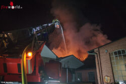 Der Leitstelle waren Feuer und Rauch, die aus den Gebäuden eines Produktionsbetriebes schlagen sollten, gemeldet worden. Das Ausmaß des Feuers zeigte sich den anrückenden Kräften schon auf der Anfahrt: Rauch und Flammen schlugen weit sichtbar aus den Dächern der Betriebshallen.