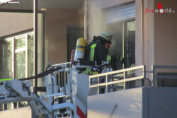 Laut Mittteiler qualme es aus einer Wohnung im ersten Stock eines Mehrfamilienhauses. Schon auf der Anfahrt war diese Rauchentwicklung sichtbar. Sofort entschied sich der Einsatzleiter der Feuerwehr zu einem Löschangriff über die Drehleiter. Als sich der eingesetzte Atemschutztrupp im Korb der Drehleiter dem Fenster der Brandwohnung näherte, erkannten sie eine am Boden liegende Person in der Brandwohnung. Diese wurde von den Einsatzkräften über die Drehleiter gerettet, notärztlich versorgt und in eine Klinik verbracht. Parallel hierzu wurde der Brand in der Wohnung mit einem C-Hohlstrahlrohr bekämpft und gelöscht. Ein zweiter Atemschutztrupp erkundete das Treppenhaus, um auch von dieser Seite einen Löschangriff vorzubereiten.