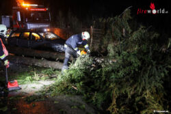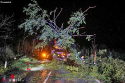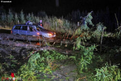 Drei Bäume stürzten durch die starken Sturmböen auf die Innbachtal-, beziehungsweise Vogelweider Straße im Welser Stadtteil Oberthan. Ein Pkw-Lenker konnte sein Fahrzeug nicht mehr rechtzeitig abbremsen und kollidierte mit den Bäumen. Er blieb zum Glück unverletzt. Feuerwehr und Abschleppunternehmen beseitigten die Sturmschäden sowie das Unfallfahrzeug. Die Straße war rund zwei Stunden für den Verkehr gesperrt.